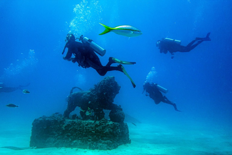 At about 12 meters (40 feet) deep, divers swim between columns, under arches and past statues of lions, starfish, turtles and other marine animals.