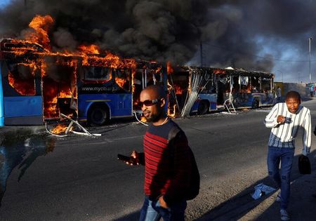 CAPE TOWN (Reuters) – Two buses were set on fire on Monday in South Africa’s Cape Town as local taxi associations embarked on a two-day strike to protest against a termination of an incentive program.