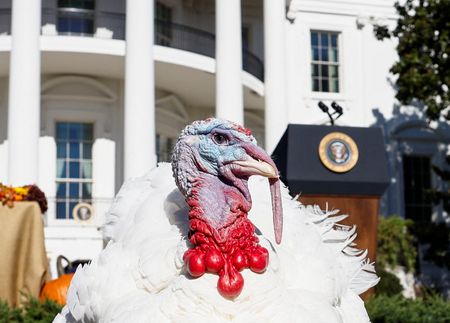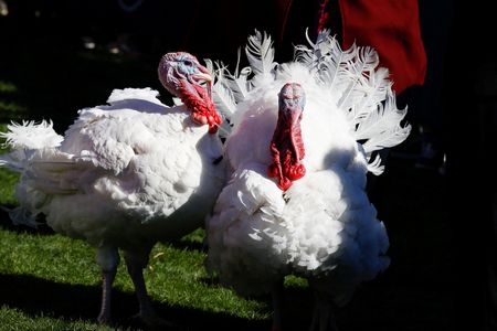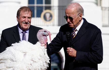 WASHINGTON (Reuters) -U.S. President Joe Biden, wearing his trademark aviator sunglasses, pardoned two turkeys from North Carolina named Chocolate and Chip on Monday, sparing them from Thanksgiving dinner tables.