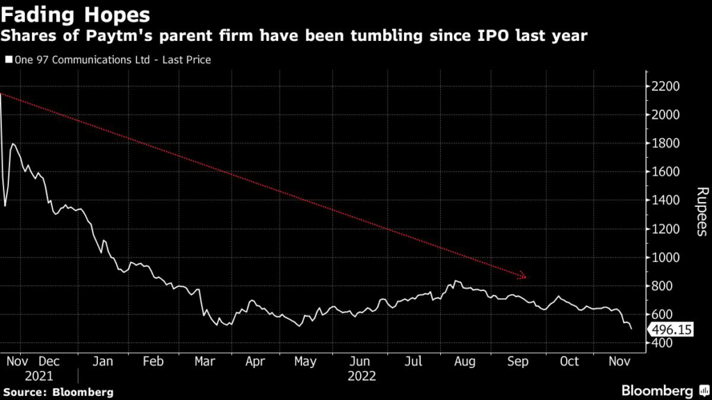 The stock has dropped about 75% from its listing price as Paytm’s losses widened and SoftBank Group Corp. lowered its stake in the company.