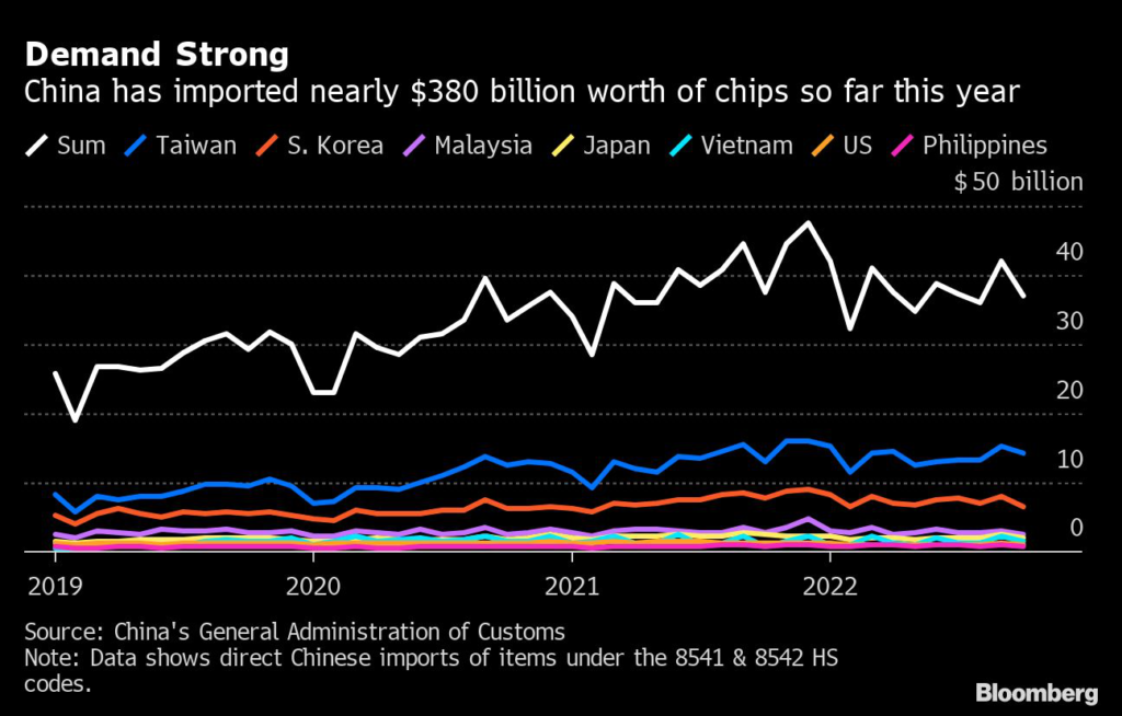 China is the world’s largest importer of semiconductors, with many of them being assembled into electronics or other goods which are then re-exported.