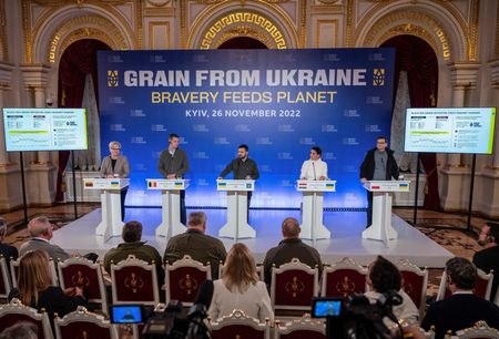 KYIV (Reuters) -Ukrainian President Volodymyr Zelenskiy hosted a summit in Kyiv with allied nations on Saturday to launch a plan to export $150 million worth of grain to countries most vulnerable to famine and drought.