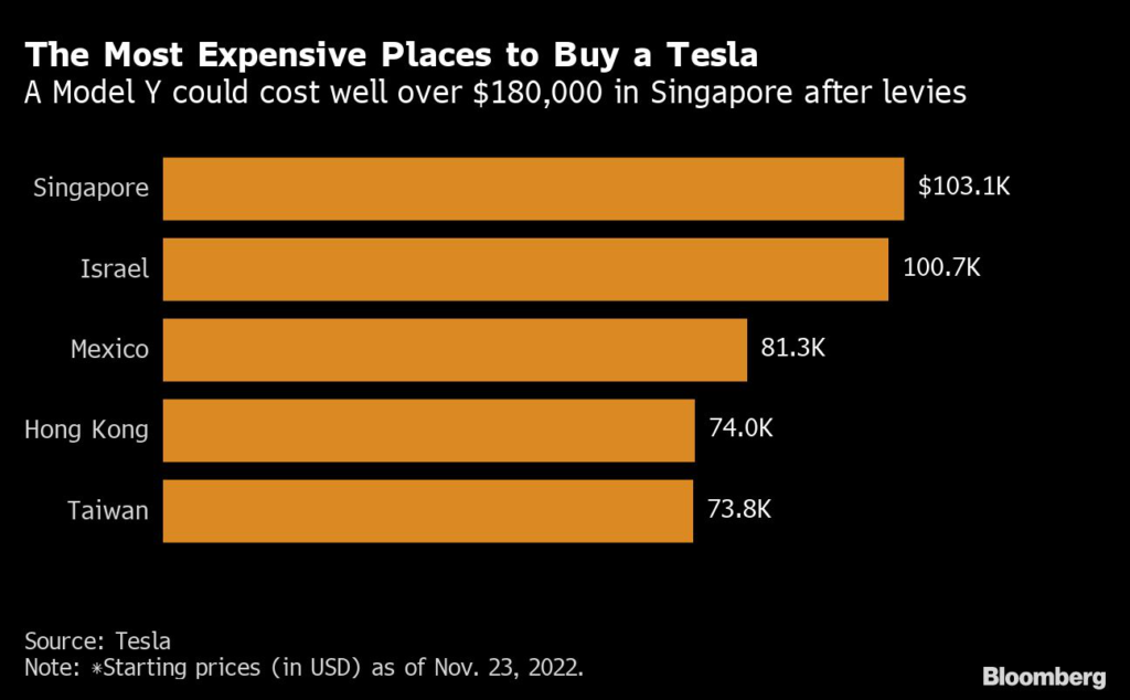 Indeed, buying a Tesla in Singapore could cost as much as an apartment. Cars in the city-state are so expensive because there are only a limited number of ownership permits (aimed at controlling traffic growth on the small island).