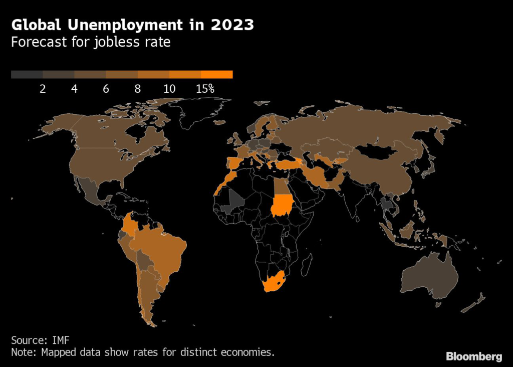 Bloomberg Economics projects that unemployment will rise by about 3.3 million across developed economies by 2024, a period in which most are expected to suffer recessions.