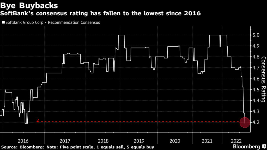 Sell-side analyst opinion on SoftBank Group Corp. has tumbled to a six-year low as the Japanese technology giant refrains from new stock buybacks amid continued investment losses.