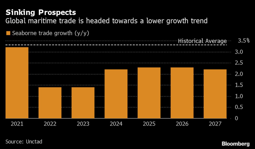 Unctad projects that growth in total seaborne trade will be 1.4% in 2023, unchanged from this year’s level, before averaging just above 2% in each year after that through 2027.