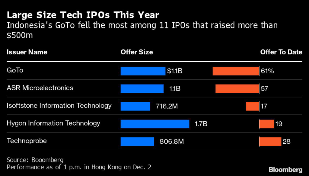 (Bloomberg) — GoTo Group’s post-IPO stock selloff makes it the worst performer among 11 tech and internet companies that raised more than $500 million in inaugural share sales this year.