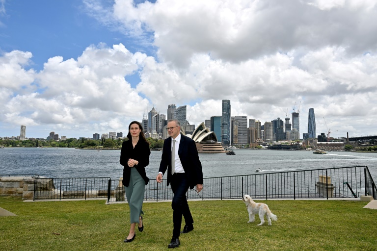 Australian Prime Minister Anthony Albanese (R) welcomes Finland’s Prime Minister Sanna Marin at Kirribilli House in Sydney