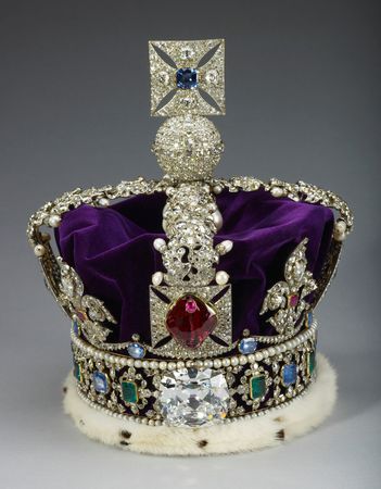 The St Edward’s Crown, made up of a solid gold frame set with rubies, amethysts, sapphires, garnet, topazes and tourmalines, follows its original medieval forebear in having four crosses-pattée and four fleurs-de-lis.