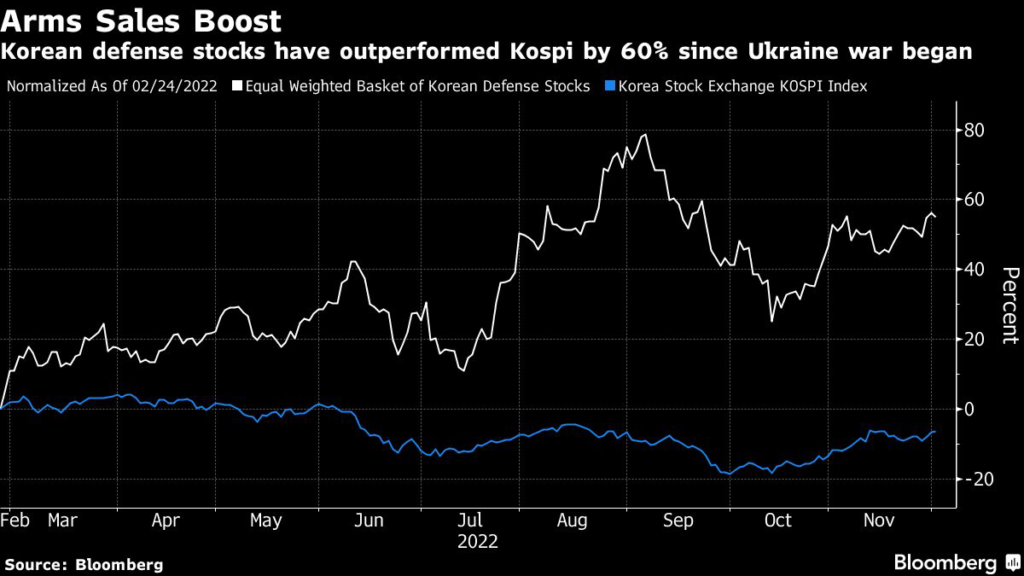 and LIG Nex1 Co. have skyrocketed since the war began in Ukraine in February, outpacing gains in the South Korea’s benchmark Kospi index by 60%.