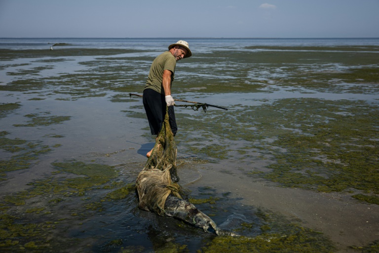 A scientist heaves a dead dolphin through Ukraine's Limans Tuzly Lagoons National Nature Park on August 28, 2022
