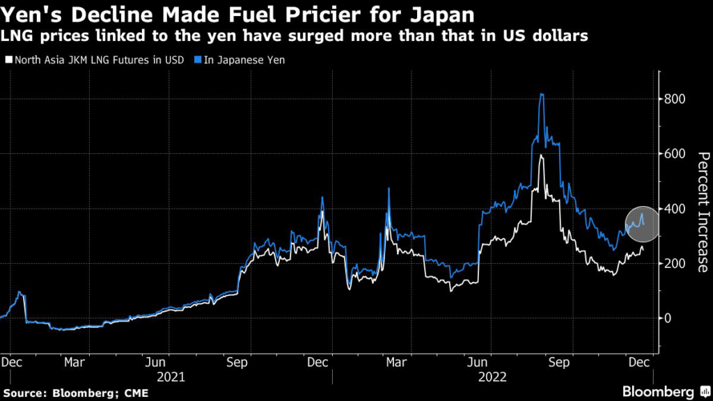 Liquefied natural gas prices in yen terms have more than quadrupled in the last two years, compared to a threefold increase when pegged to the dollar.