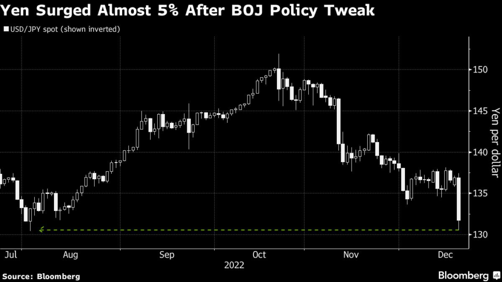 The yen surged as much as 4.8% on Tuesday after the BOJ unexpectedly raised its cap on 10-year bond yields to 0.5% from 0.25%.