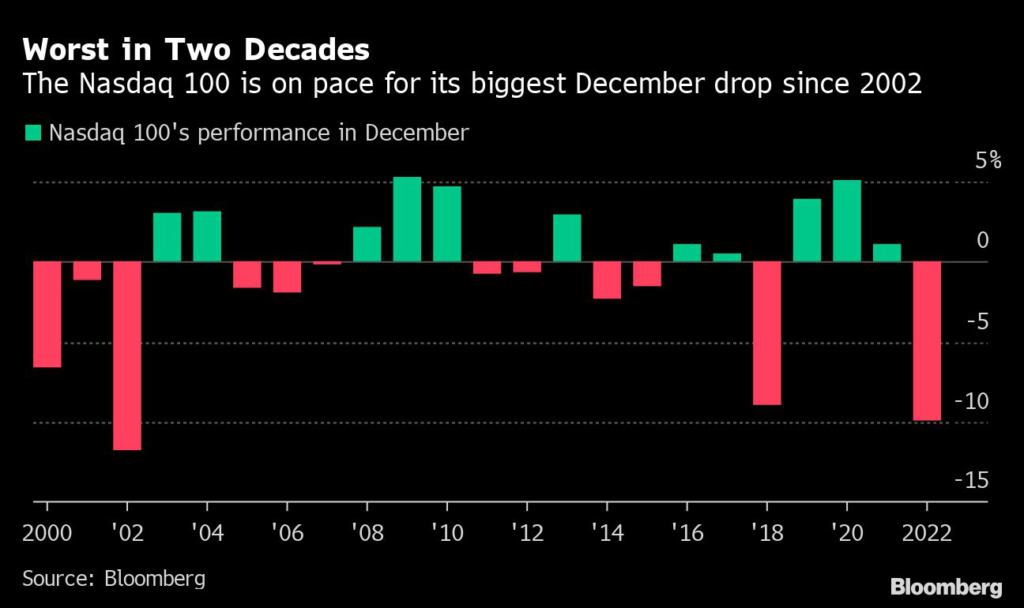 (Bloomberg) — Technology stocks are headed for their worst December since the bursting of the dotcom bubble two decades ago as optimism about potential relief from Federal Reserve interest-rate hikes fades on signs of labor-market strength.