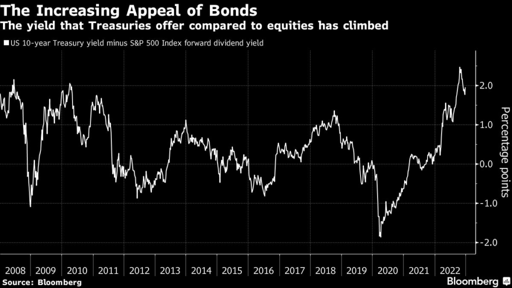 With the prospects of an economic slump dimming the outlook for corporate America right now, the estimated dividend yield that stocks offer is looking less attractive compared to fixed income.
