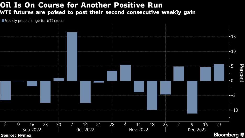 Crude is still on track for a modest yearly gain after a volatile year where Russia’s invasion of Ukraine upended oil markets.