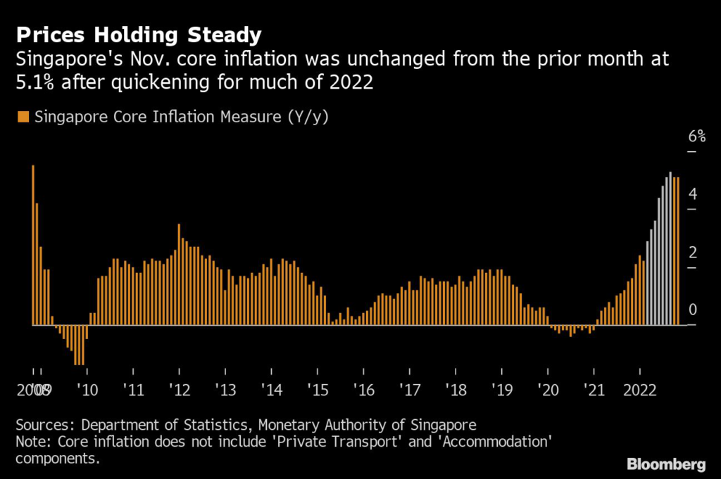 Core inflation, which excludes private transport and accommodation and is closely watched by the central bank, increased 5.1% from a year earlier for a second straight month, according to a joint statement Friday from the Monetary Authority of Singapore and the Ministry of Trade and Industry.