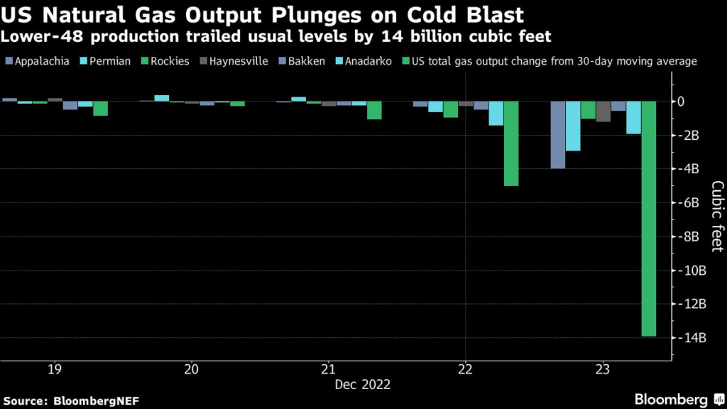 (Bloomberg) — US natural gas production suffered its biggest one-day drop in more than a decade on Friday as the massive winter storm battering much of North America froze liquids in pipes and forced wells to shut down.