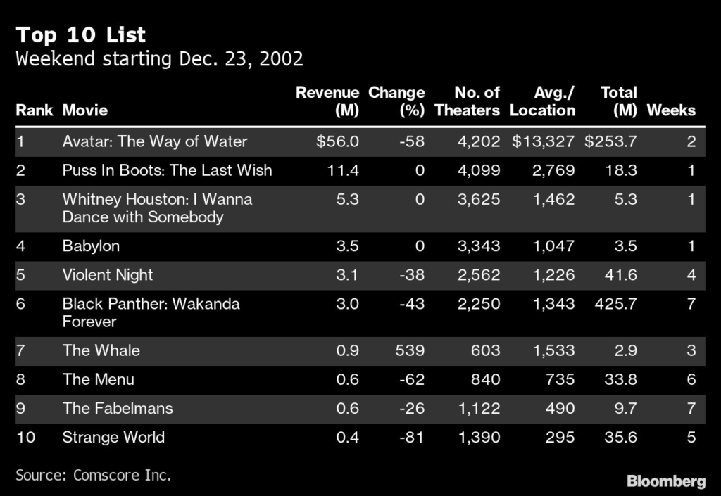 (Bloomberg) — Walt Disney Co.’s science-fiction epic Avatar: The Way of Water battled winter storms in the US and Canada to bring in an estimated $56 million in ticket sales this weekend through Sunday.
