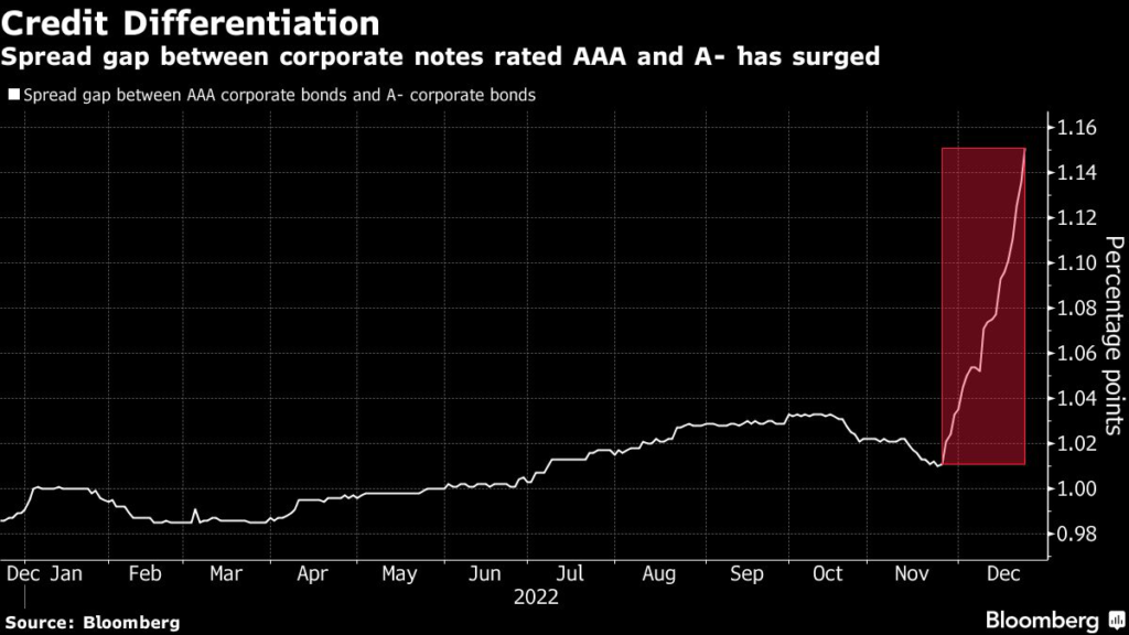 The divergence is reflected in the surging spread gap between corporate notes rated AAA and A- to the widest in almost two years.
