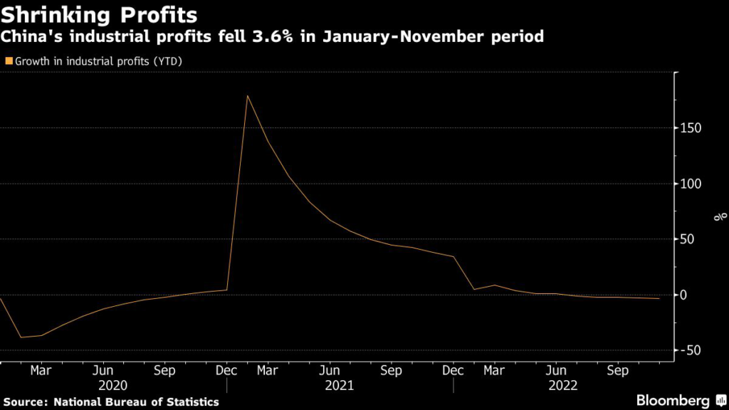 Profits at industrial firms in China declined in the first 11 months of the year, as production slowed and factory-gate prices fell amid Covid disruptions.