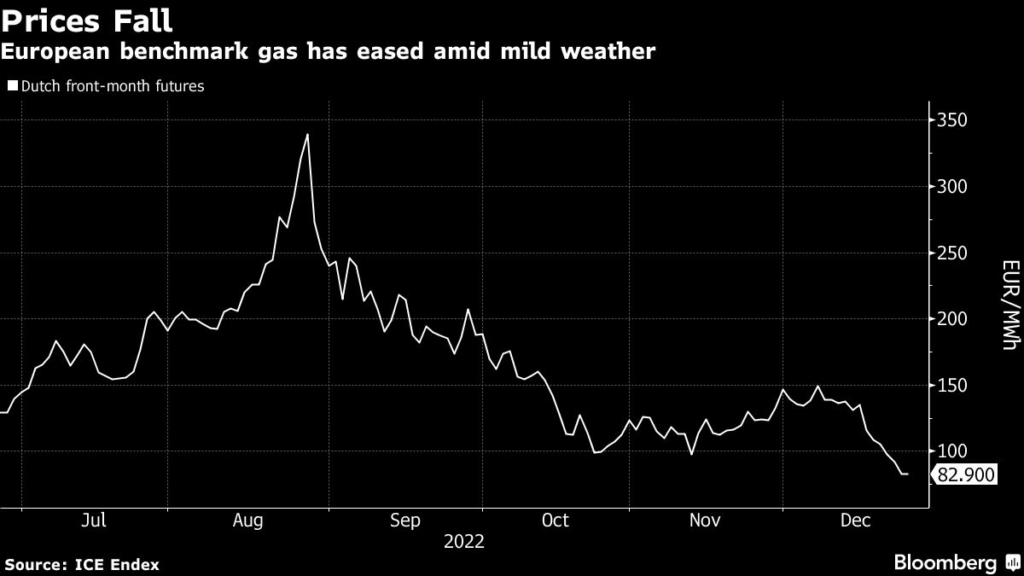 (Bloomberg) — European gas prices extended declines on Tuesday as mild weather at the end of the year eased supply concerns and buoyed stockpiles.