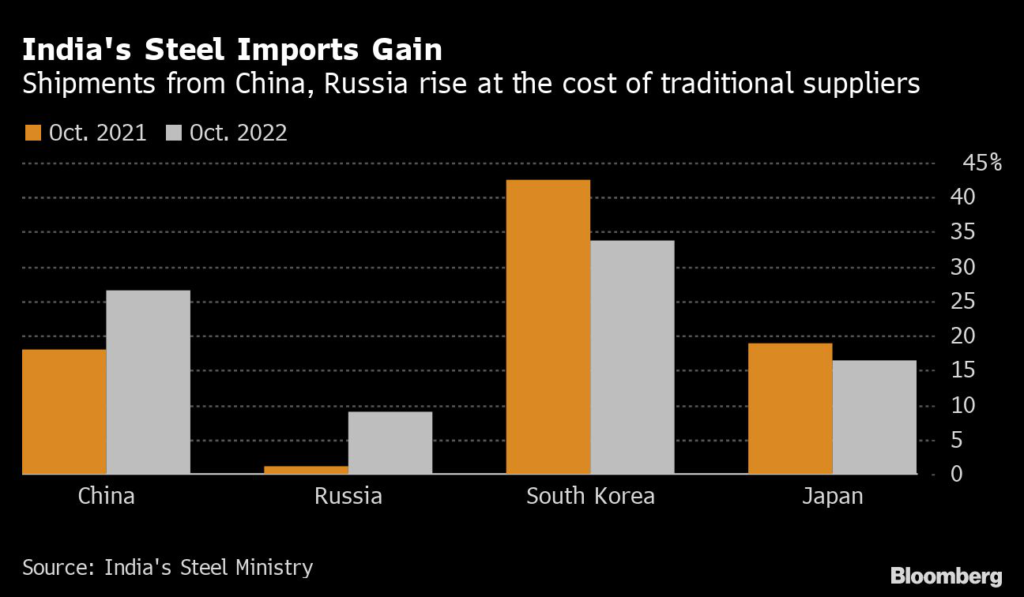 China accounted for more than a quarter of imports in October, while some Russian steel is also reaching India, the government data show.
