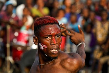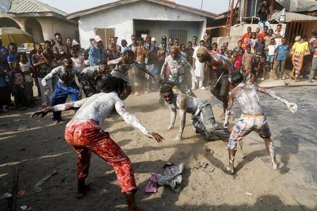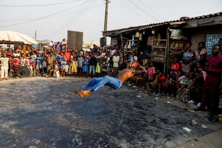 LAGOS (Reuters) – In a street in a poor neighbourhood of Lagos, a bare-chested young man, Gift Eze, holds his screaming partner, helping calm the rage within and stop him fighting.