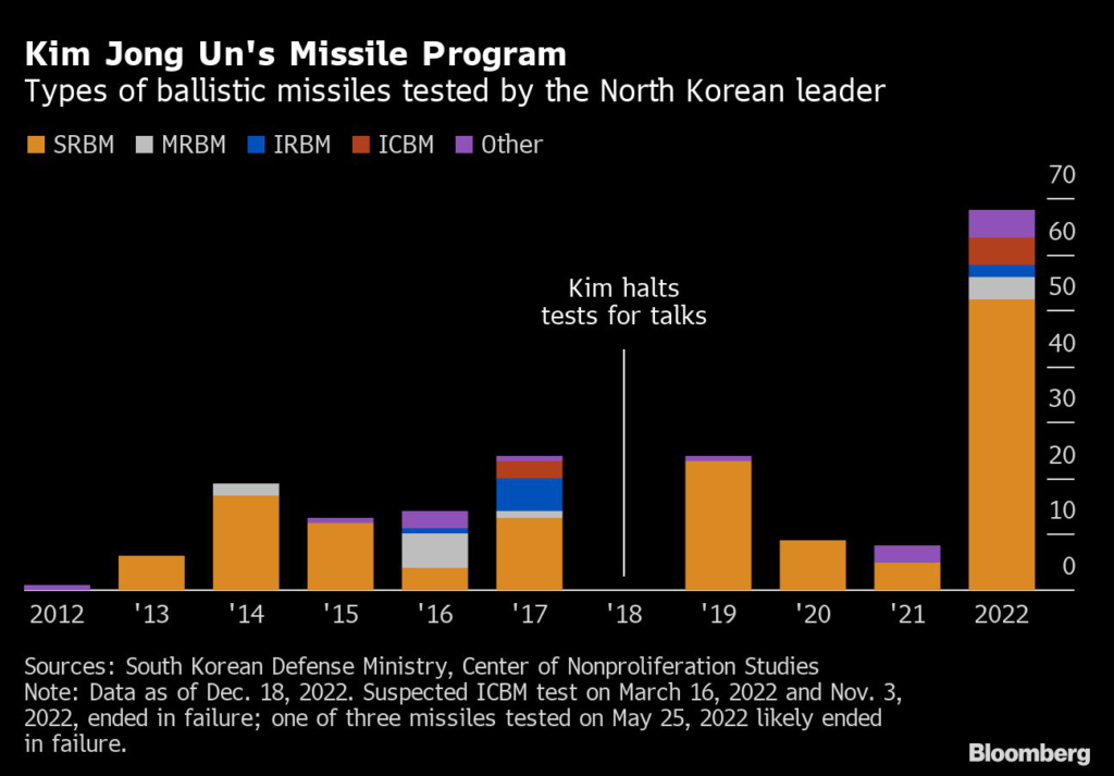 Kim Jong Un in 2022 fired off missiles at a record pace, lowered the threshold for using nuclear weapons and thumbed his nose at global sanctions. He’s likely to turn up the heat even more in the coming year.