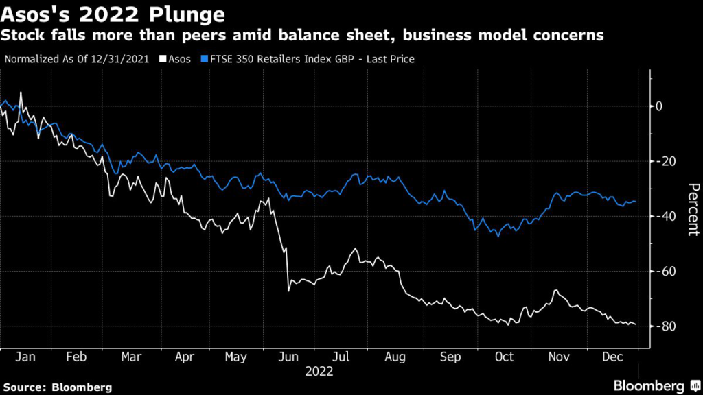 Asos Plc is the UK’s worst-performing stock of 2022, plunging 78% as cash-strapped Britons cut spending on clothes and the online retailer struggles with soaring costs and rising debt.