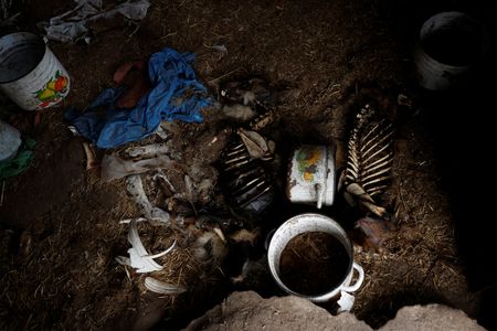 YAMPIL, Ukraine (Reuters) – As the sound of exploding artillery echoes in the distance, Senia, a big white bunny, twitches nervously in the arms of his owner.