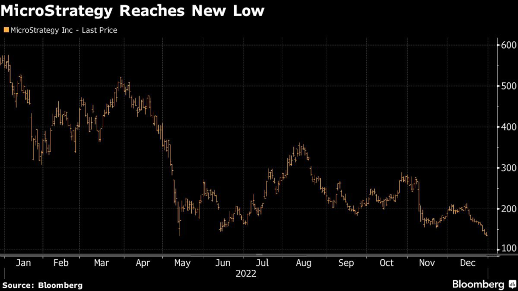 MicroStrategy Inc. shares touched the lowest level since August 2020 after the enterprise-software firm, better known in recent years as the largest corporate buyer of Bitcoin, disclosed its first ever sale of the token.