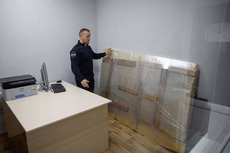 The artwork, depicting a woman in a gas mask and a dressing gown holding a fire extinguisher, was taken off a wall in the town of Hostomel on Dec.