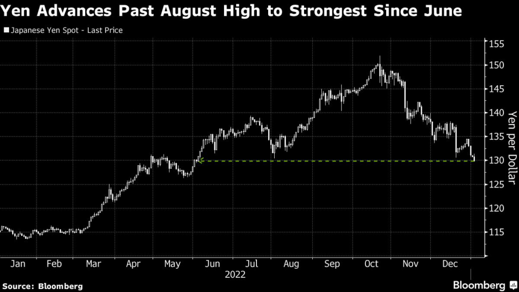 The currency appreciated as much as 0.8% to 129.79 per dollar, surpassing the level of 130.41 set in August, and reaching the strongest since June.