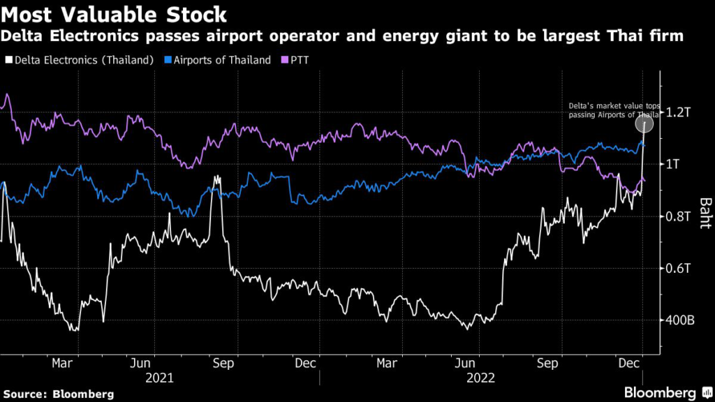Delta Electronics (Thailand) Pcl, a unit of Taiwan-based Delta Electronics Inc., overtook the world’s most-valuable airport operator and an oil giant to become Thailand’s largest listed company on optimism about demand for its server, cloud-storage and EV-charging products.