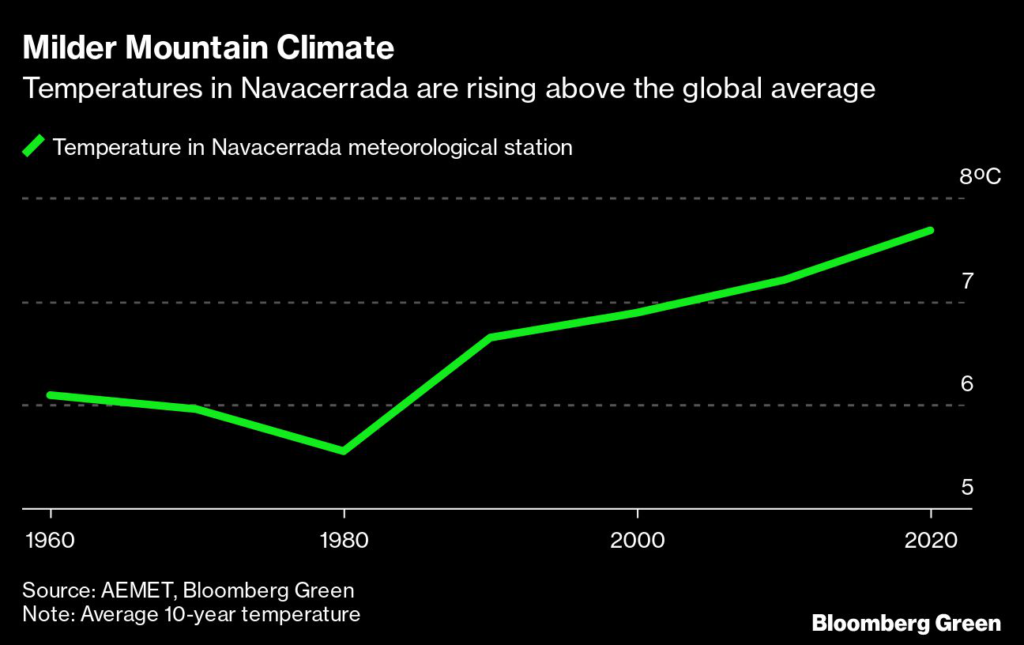 Warming in this area of Spain didn’t happen overnight, but it has been relentless. Average temperatures in Navacerrada have increased by 1.6C since measurements started in the 1950s, according to data from Spain’s meteorological agency AEMET compiled by Bloomberg Green.