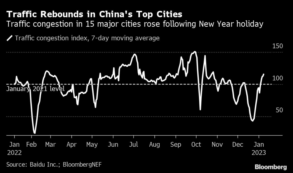 Traffic congestion in 15 major cities on Sunday climbed to 116% of the level seen in January 2021, according to an index compiled by BloombergNEF based on Baidu Inc.