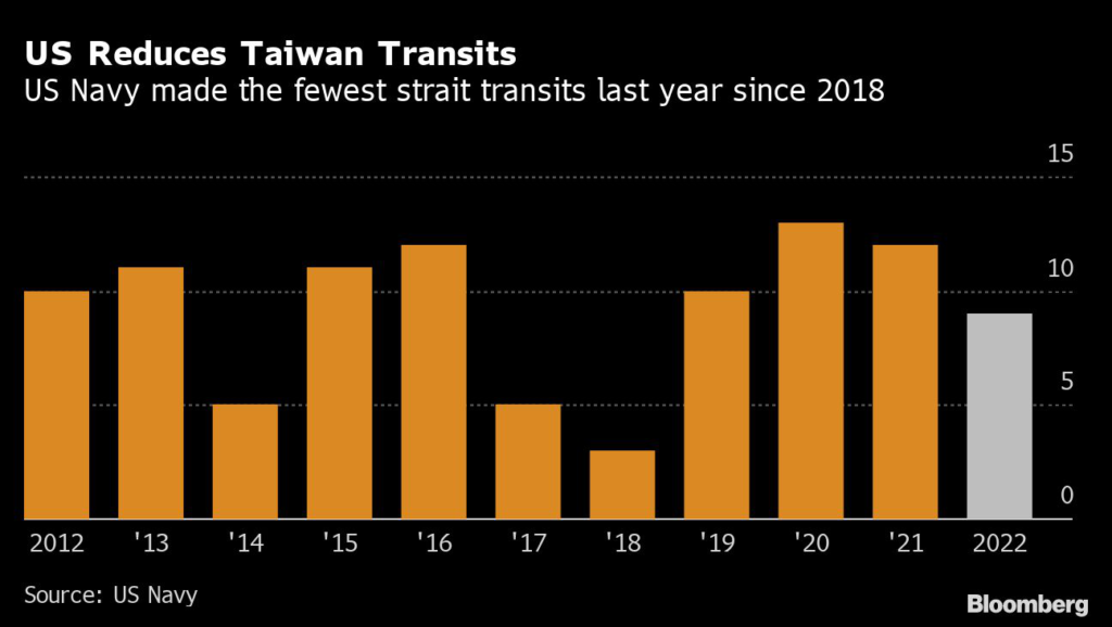 The US reduced its number of naval transits through the Taiwan Strait in 2022 to the lowest level in four years even as China stepped up military pressure on the island it vows to one day control.