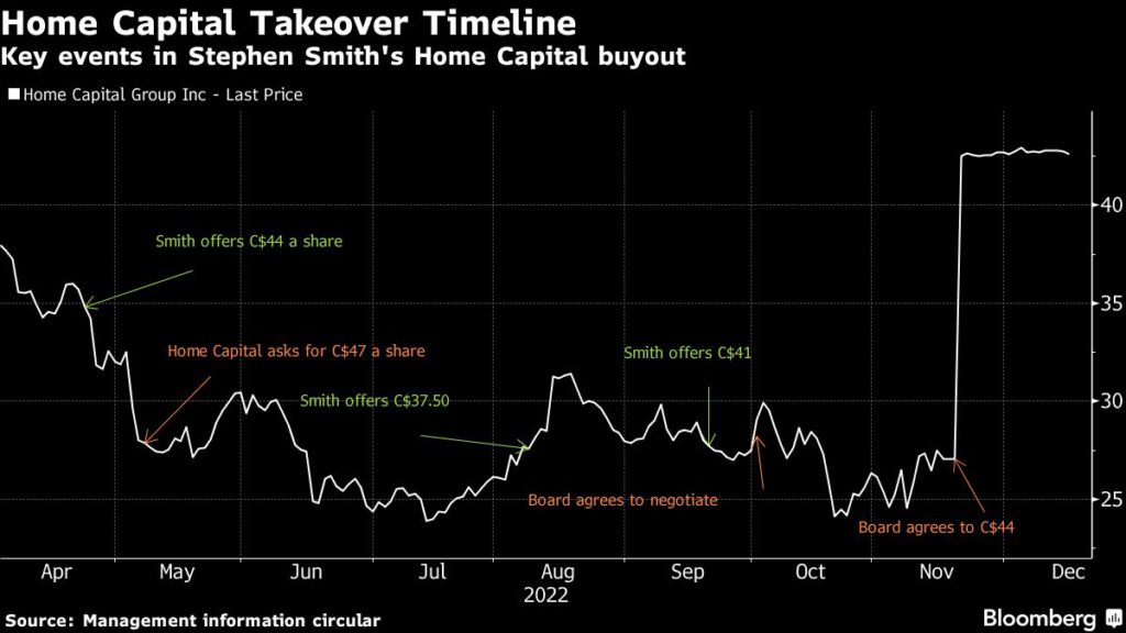 Smith first offered to buy Home Capital Group Inc. for C$44 a share last April, but the lender’s board asked for C$47 a share instead, according to a regulatory filing released Tuesday.