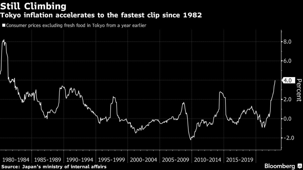 (Bloomberg) — Tokyo’s inflation outpaced forecasts to hit 4% for the first time since 1982, suggesting the underlying price trend is stronger than expected by economists, a factor that could further fuel speculation the Bank of Japan will adjust policy again.