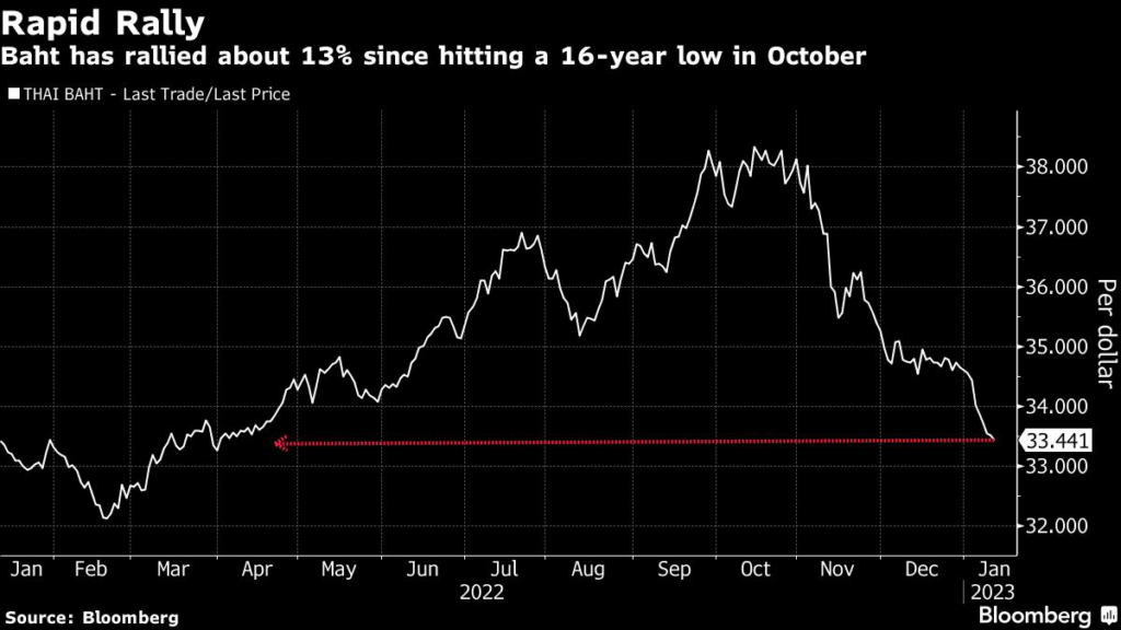 The baht has gained 13% against the US dollar since hitting a 16-year low in October.