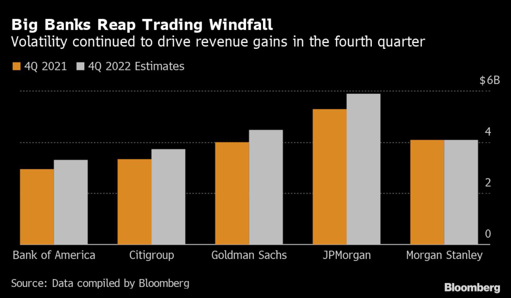 (Bloomberg) — The market volatility and interest-rate hikes that gave US banks their biggest windfall last year may prove to be their biggest headache in 2023.