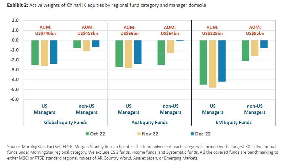 US-based funds remain underweight China across three main mandates: emerging markets, Asia ex-Japan and global equity, according to the Morgan Stanley analysis.