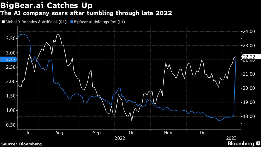 (Bloomberg) — BigBear.ai soared 260% Thursday, the biggest one-day jump on record, after the US Air Force awarded a contract valued at up to $900 million.