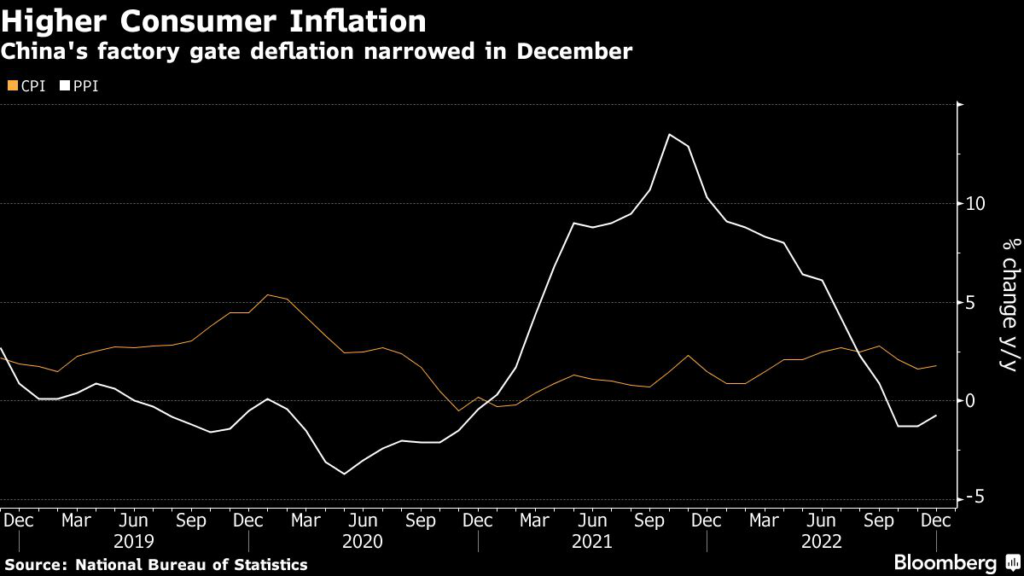 A narrowing in PPI declines — the first up arrow in more than a year — showed upward pressure on factory-gate prices is emerging, likely driven by optimism the economy will rebound in 2023.