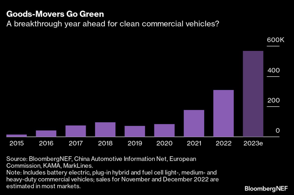Sales of zero-emission vans and trucks will continue to rise quickly and should hit almost 600,00 globally in 2023, up over 80% from 2022.