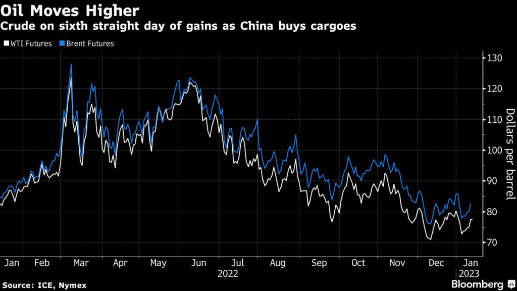 (Bloomberg) — Growing confidence in China’s recovery and mounting evidence of cooling US inflation buoyed crude prices for a sixth day.