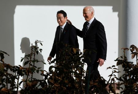 WASHINGTON (Reuters) – U.S. President Joe Biden welcomed Japanese Prime Minister Fumio Kishida at the White House on Friday and told him that the United States strongly supports the defense of Japan.