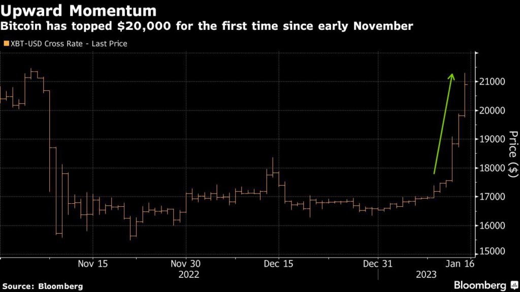 (Bloomberg) — Bitcoin surged over $21,000 on Saturday amid optimism that it may have bottomed and inflation has peaked.