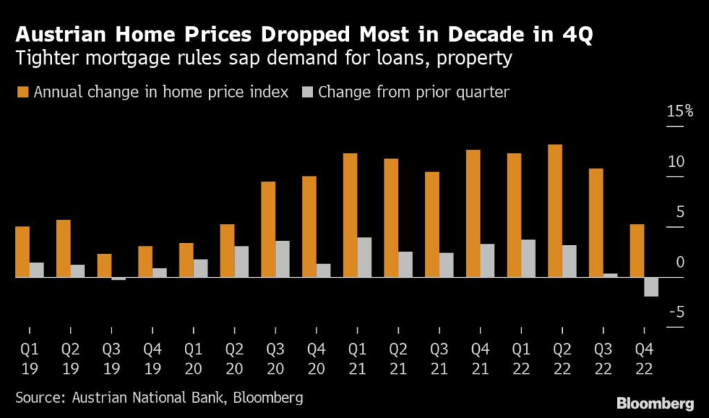 (Bloomberg) — Austrian home prices tumbled the most in more than a decade at the end of last year, as tighter credit rules exacerbated a continent-wide slowdown in property markets.